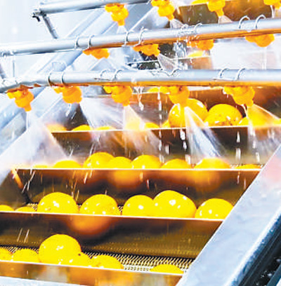 在浙江艾佳果蔬开发有限责任公司,胡柚正在生产线上进行清洗。 徐林辉摄(人民视觉)
