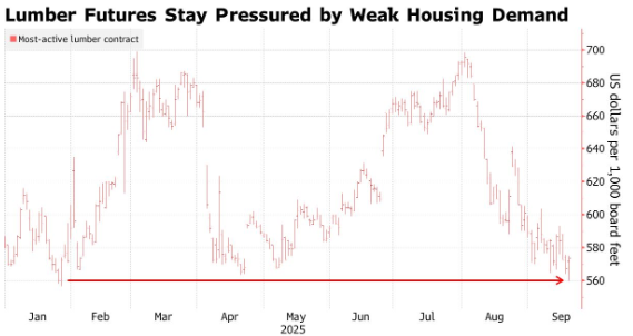 美国木材联盟(一家总部位于华盛顿的游说团体)在 9 月 9 日给特朗普政府官员的一封信中写道,木材供应商如今正面临一些人所描述的“他们所见过的最糟糕的市场状况”。该联盟称,除了新房需求疲软之外,该行业还因“大规模供应过剩”而陷入困境。此前,加拿大和欧洲的生产商在今年早些时候“竞相”在加征关税和可能出台新关税之前将产品运往美国,导致供应过剩。